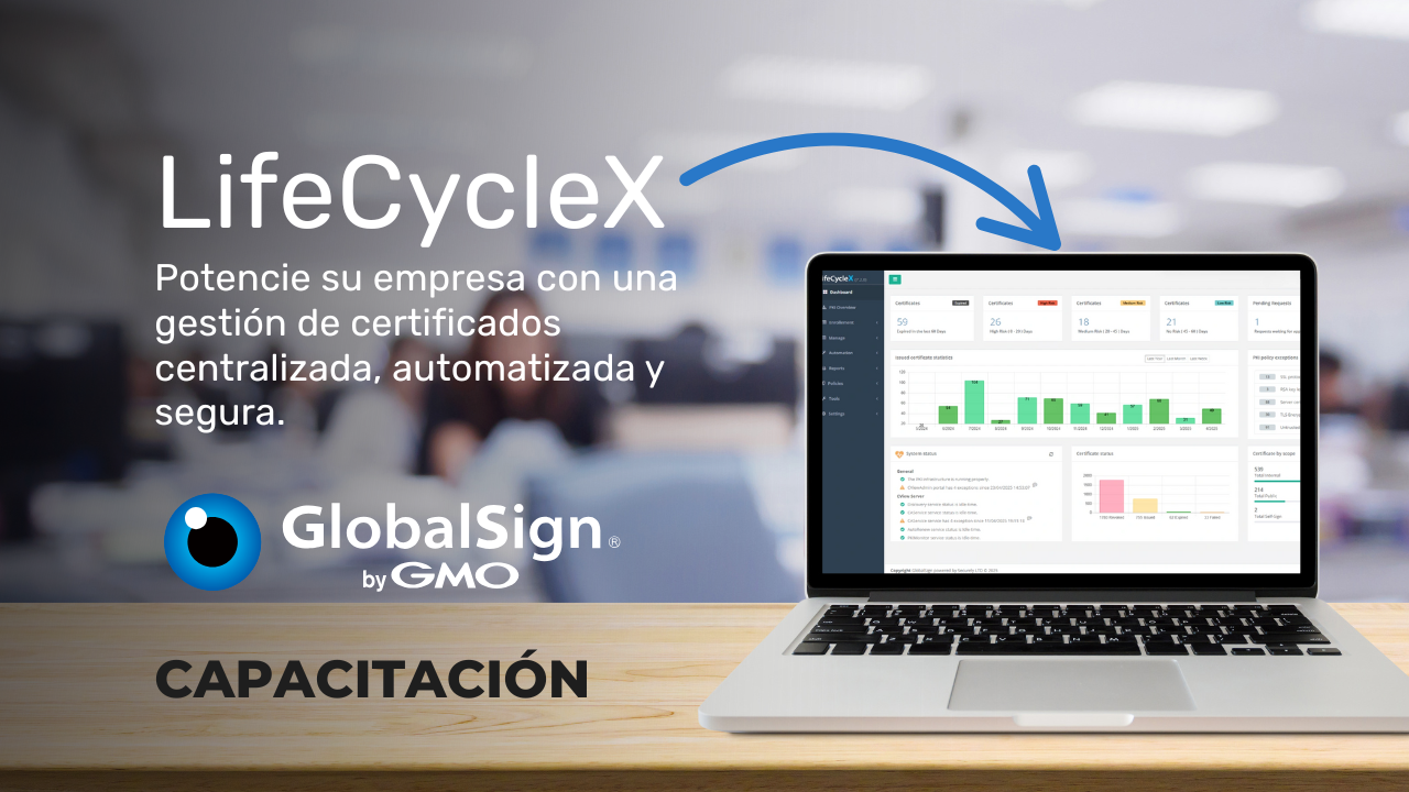 LifeCycleX (GlobalSign) es una plataforma de Certificate Lifecycle Management que centraliza y automatiza la gestión de certificados (internos y externos): descubre los certificados existentes en la infraestructura, mantiene inventario, aplica políticas de renovación, automatiza el aprovisionamiento y entrega alertas/reportes, ayudando a evitar expiraciones y reducir carga operativa en TI.