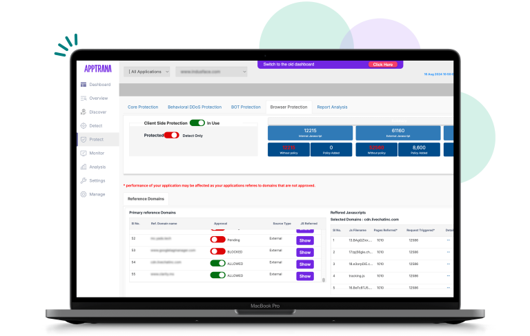 Defiéndase de amenazas como Magecart, skimming y form jacking con AppTrana Client Side Protection. Cumpla con PCI DSS 4.0 mediante el inventario, seguimiento y gestión centralizada de todos los archivos JavaScript desde un solo panel.